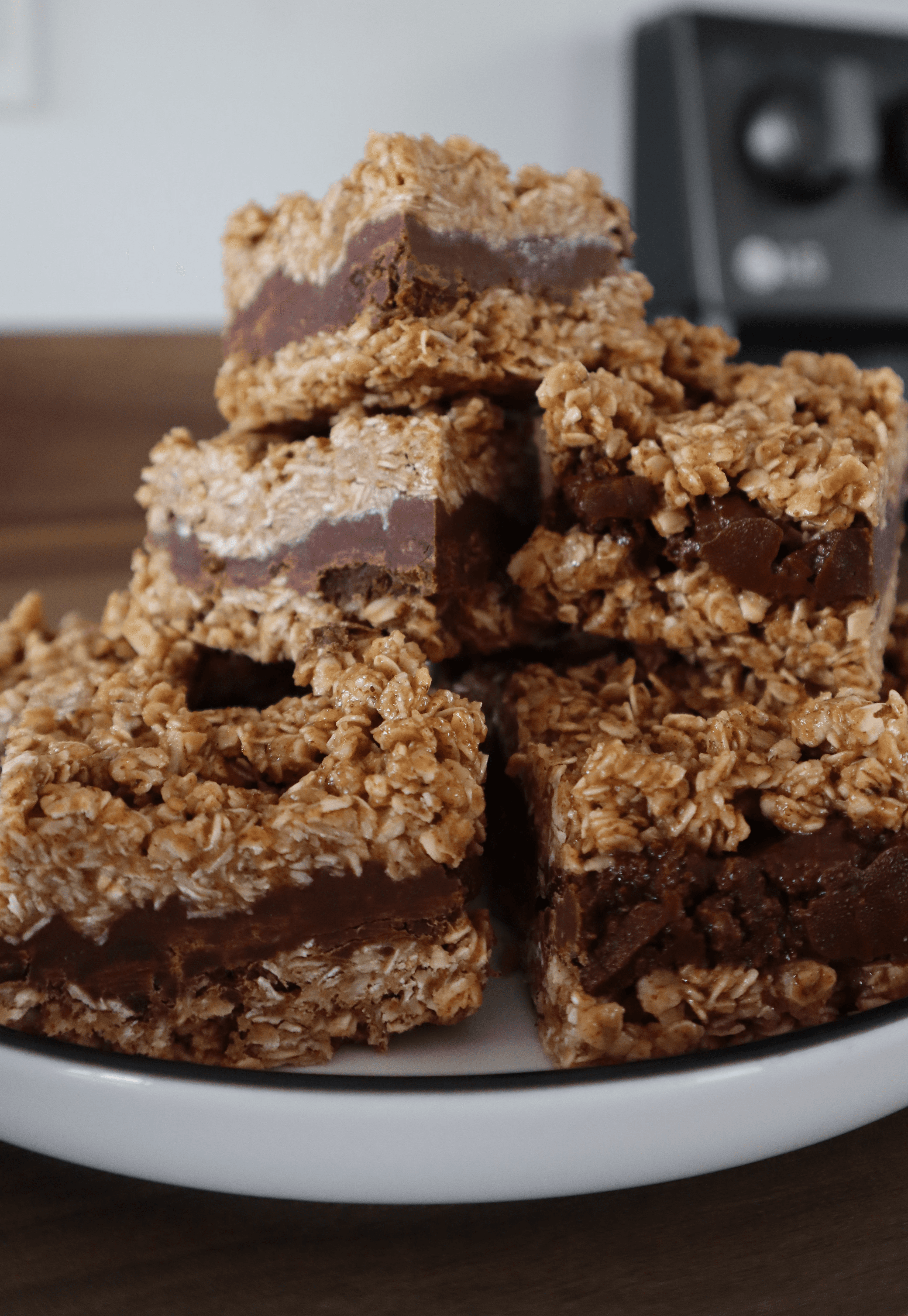 Sprinkle the remaining oat mixture over top, pressing it down gently into the chocolate layer to stick.
